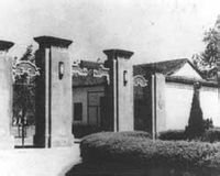 一堵低矮的厚墙紧靠着大礼堂,墙正中开一扇古色古香的月洞门,绛红色大门两边,镶嵌着一排砖雕图案。透过月洞门,只见宽敞的院子一侧,一字排列着青砖砌墙,花格门窗的琴房。琴房那微微上翘的屋角,又恰如大楼、宿舍楼和礼堂,在绿荫丛中遥相呼应,浑然一体。