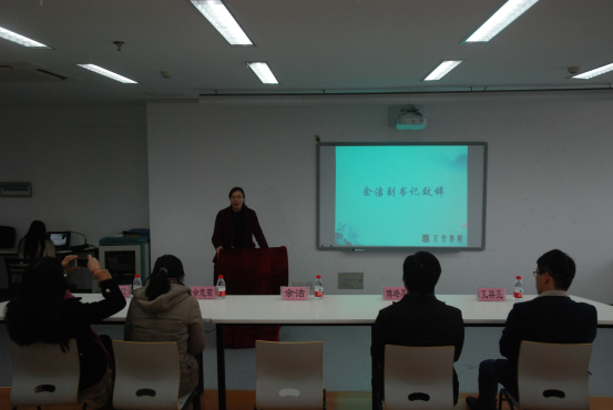 在典礼中间环节,余洁副书记致词。她对司南人才中的学员提出了三点要求,指出学生干部要学会做人,学会做事和学会学习。余洁副书记指出,作为学生干部,要十分注重自己的品行,以服务的态度,更好地为全院学生创造平台,同时,打铁还需自身硬,在锻炼自己能力的同时,要关注学习,努力学习,争取向毕业的优秀学长学姐们看齐。余洁老师表扬了学生干部们的辛苦付出,同时也强调未来的发展中,学生干部要致力于做好以上三点。
