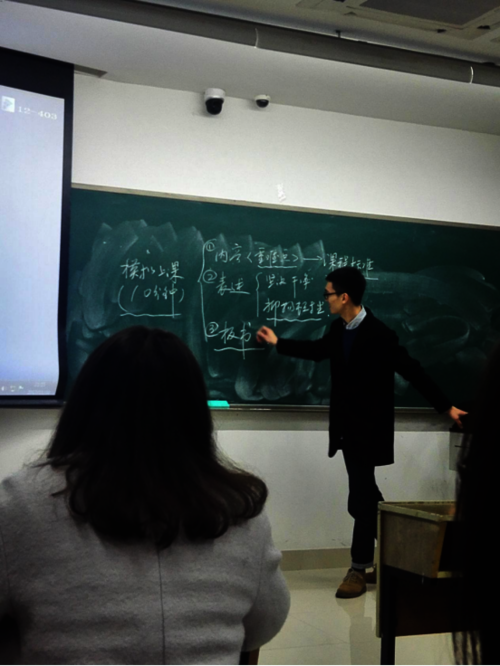 范江凯学长首先向我们介绍了进入师范生技能大赛省赛的流程和具体内容。随后,范学长向我们展示了两道演讲试题,并引导同学们自主参与回答、相互点评,令在场同学受益匪浅。同时,他还向大家展示了去年的省赛视频,并通过视频明晰省赛各个环节的注意事项。在综合素质方面,学长强调了平时积累的重要性,认为师范学子应该将学识积累当作一种日常,在每天的学习中巩固基础。而在教学能力这一方面,范江凯学长总结道:“第一,要练好基本功,学好学科知识,开拓视野;第二,要表达要坚决、干净;第三,板书要多练习,要有逻辑性”,他还建议大家回归课本,并以课本范文为例,对如何合理设定教学目标和培养自己的分析能力做了详细的阐释。最后,他还指出了大家观念中可能存在的一些误区,并表达了对学弟学妹们的美好希冀。
