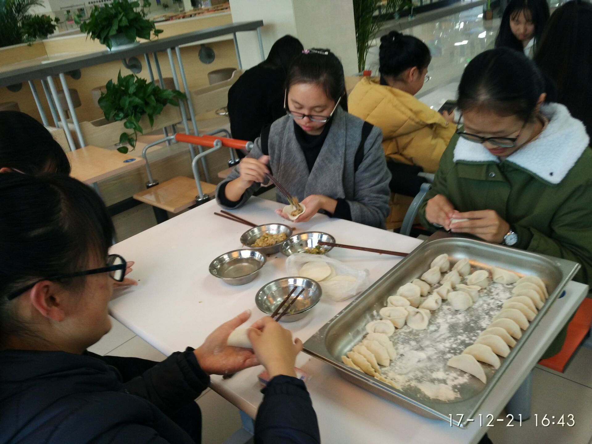 困难生“冬季送温暖”之包饺子活动在恕园8号楼食堂二楼举行。学院领导、老师同学生相聚一堂,向困难生们送去祝福,携手共同包饺子,迎冬至,贺新年。学院老师叶宏、沈志华、江素君、李俊洁,院党委副书记管庆江,辅导员傅培恩、陈晓玲、孔祥亮、陈航泽到场和全体困难生一起参加了活动。现场笑语连连,气氛融洽。