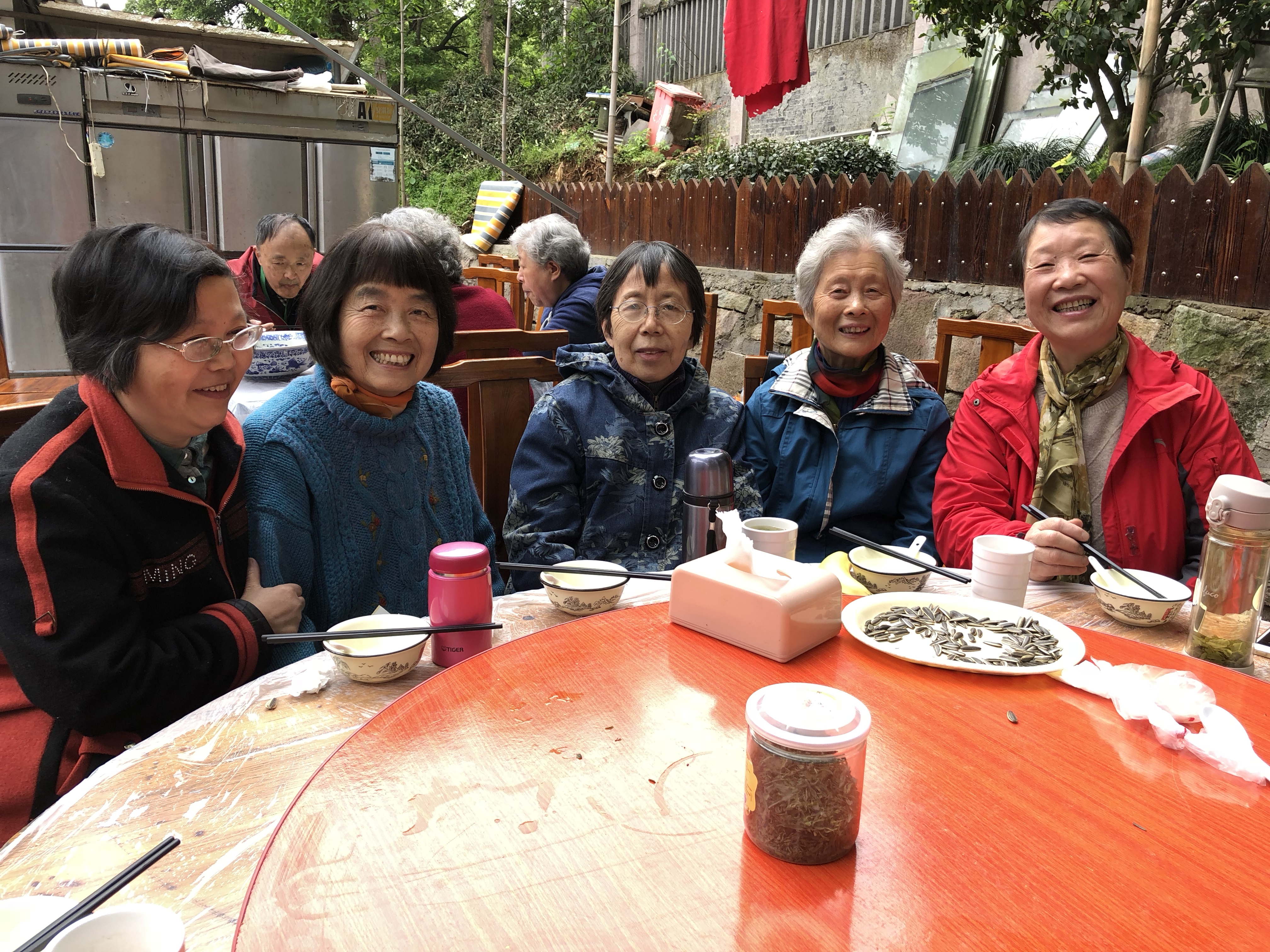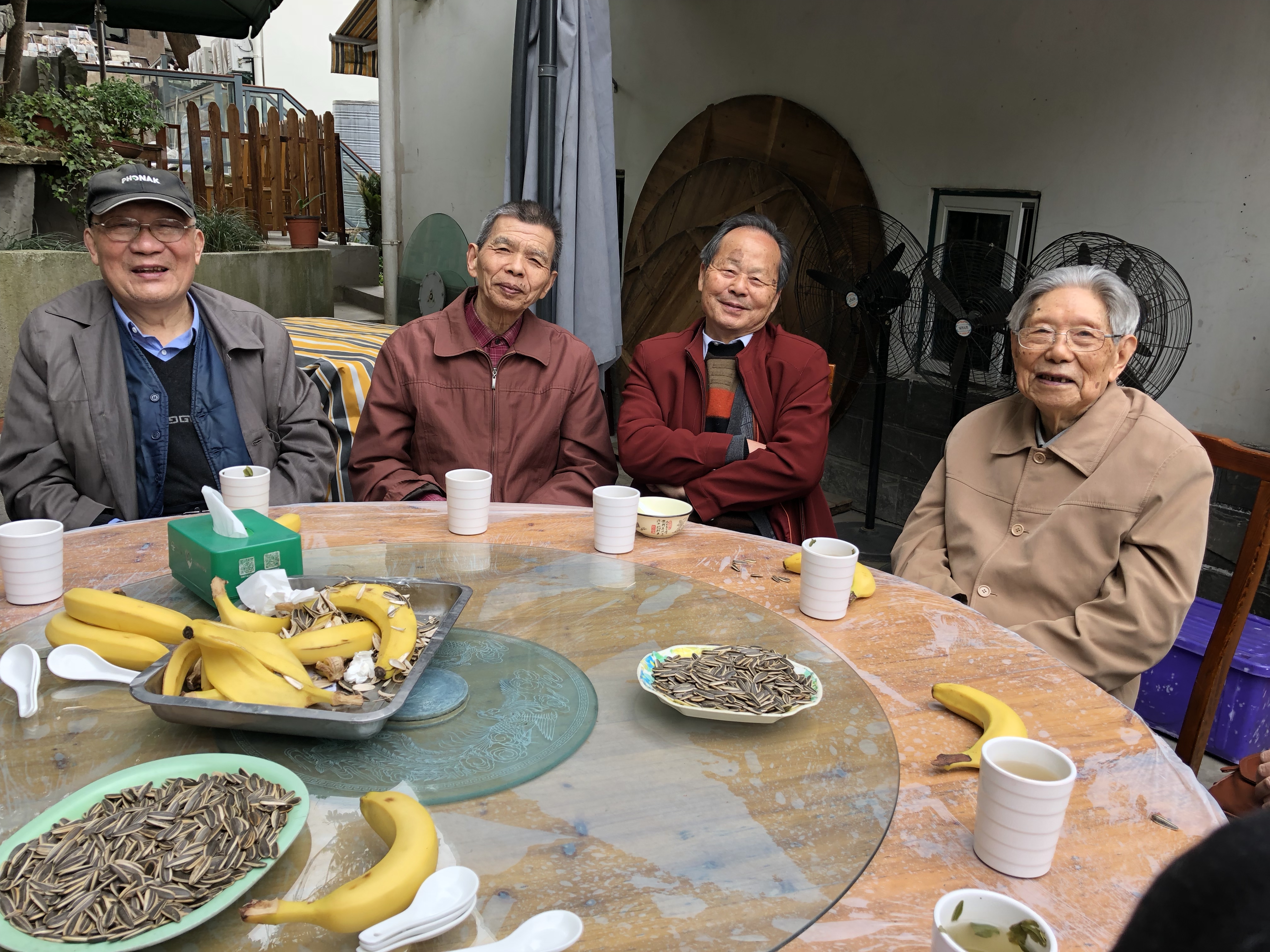 青芝坞,晋时即成村落,有着诗画江南的千年古韵。翠竹、曲桥、庭廊、流水潺潺穿村而过。老师们走在这如画的村庄,心情舒畅。大家来到绿树掩映的农家小院落座。尤为难得的是,95岁高龄的曹老师也来了。老师们互致问候、亲切交谈:谈学习、谈养生、谈保健、谈著书、谈院校的发展。气氛和谐,谈笑风生。