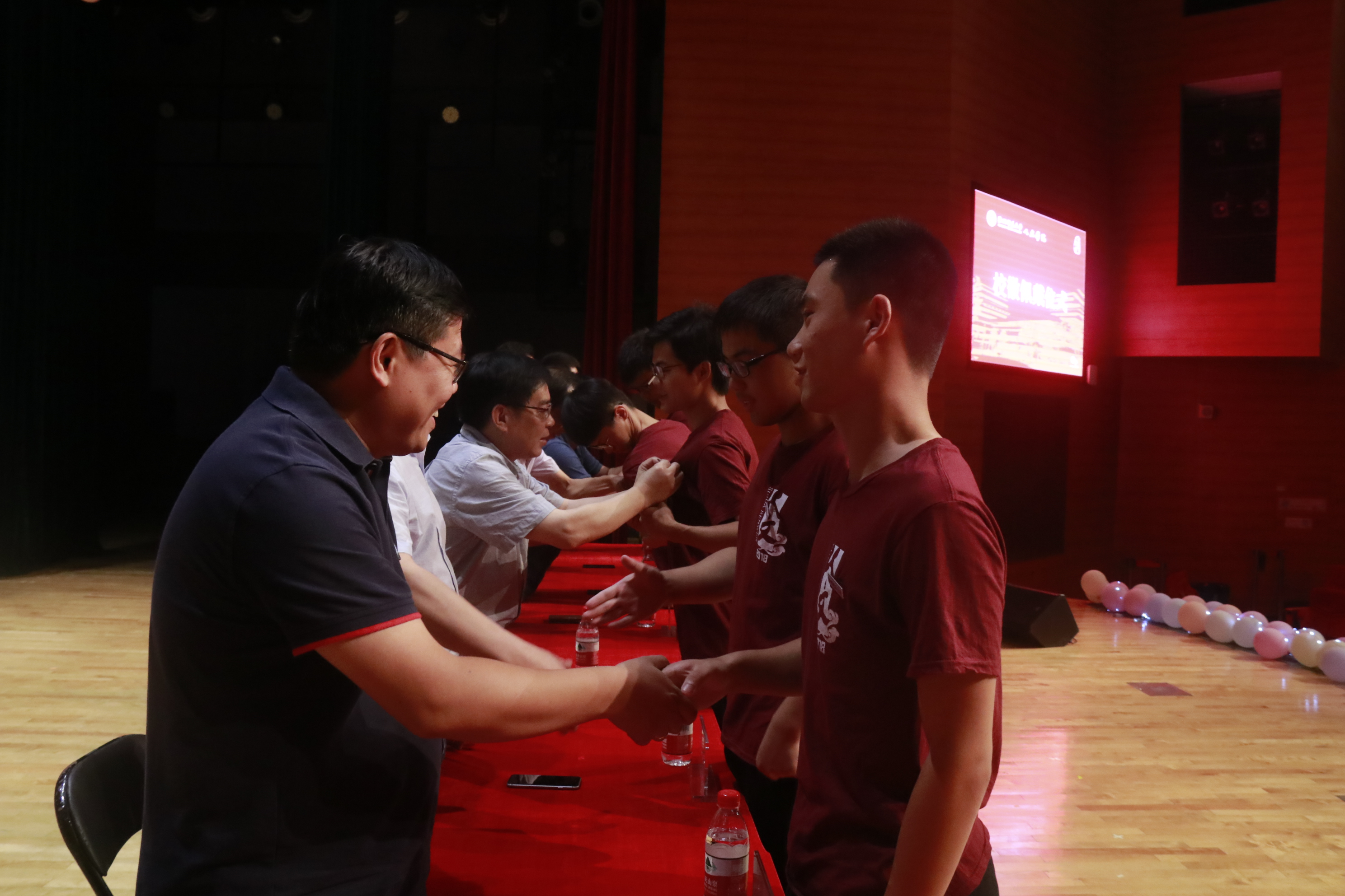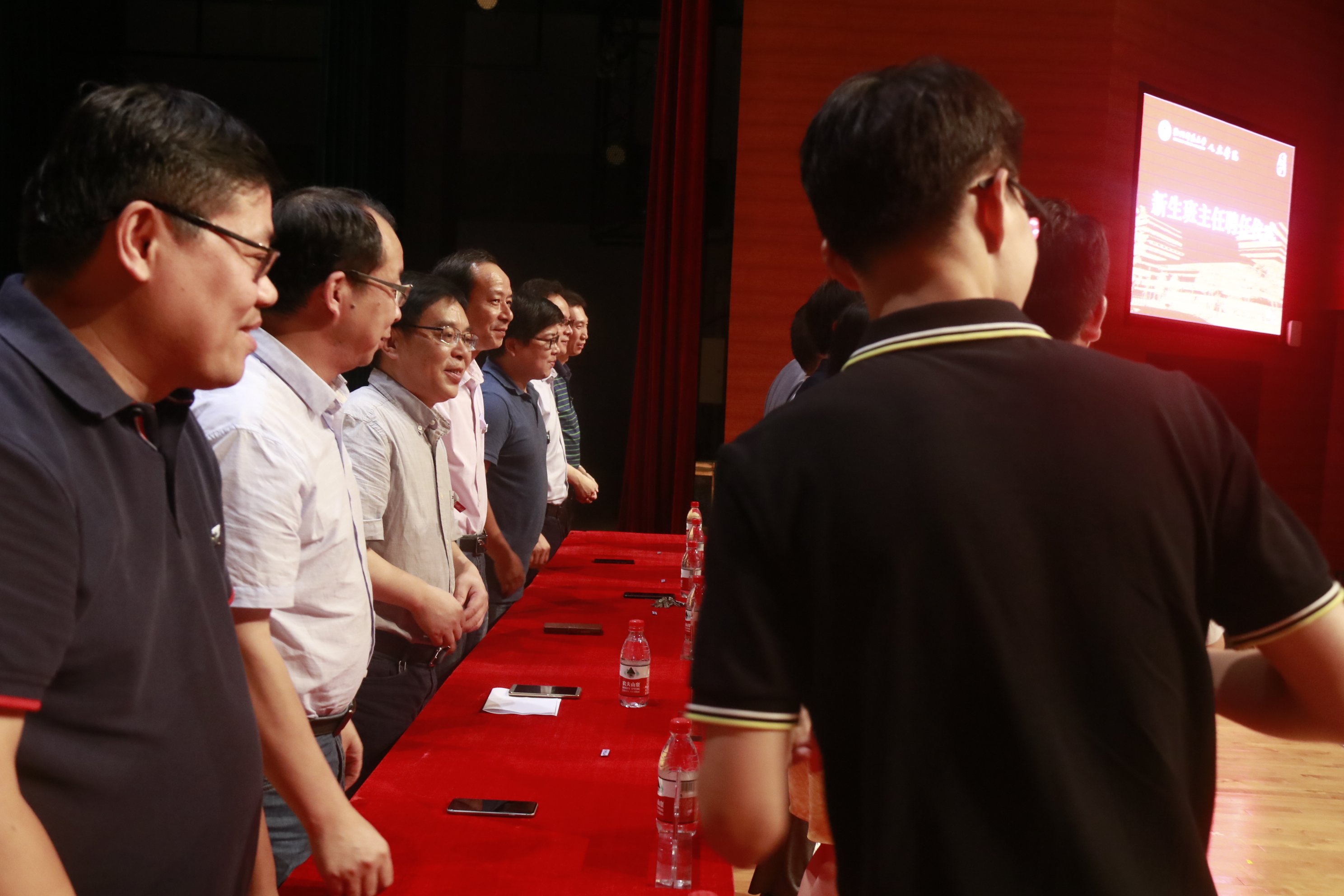 开学典礼上举行了新生班主任受聘仪式,院领导为新生班主任颁发聘书。学院领导班子和老师随后为新生代表佩戴了校徽。