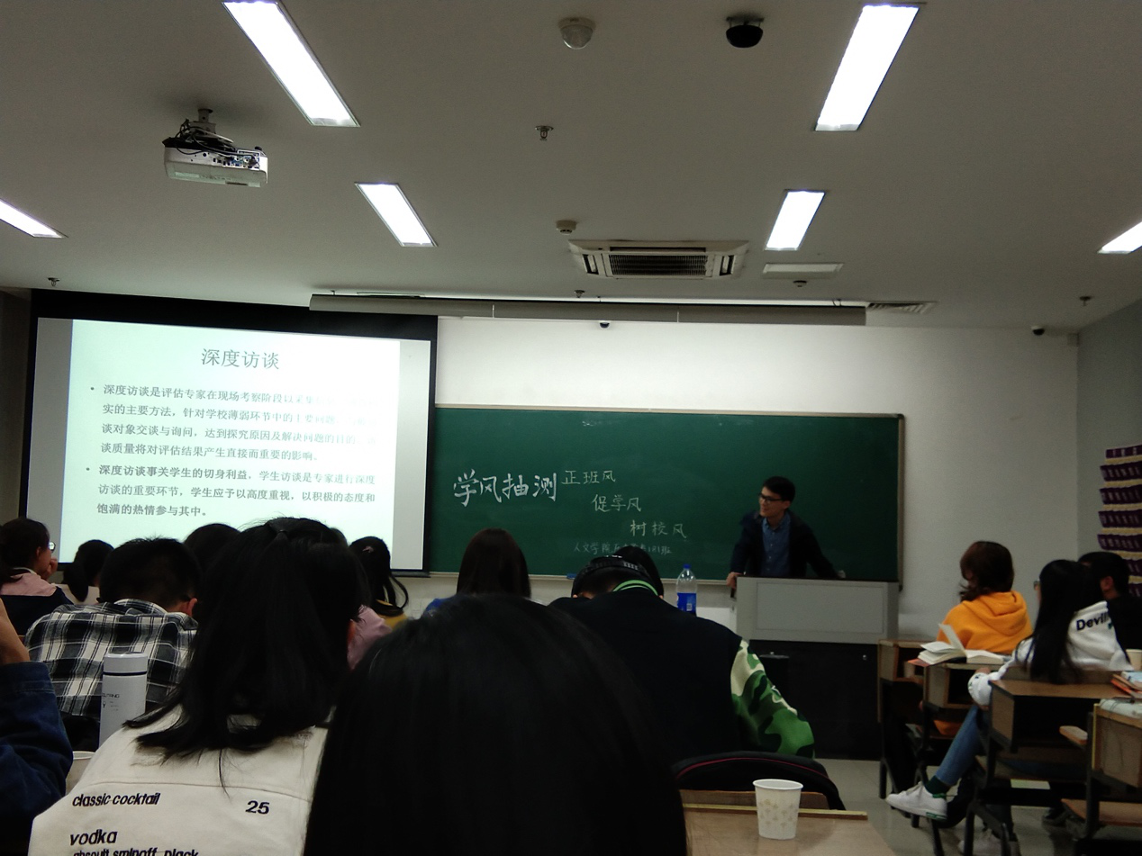 为了迎接本科教学审核评估,积极支持和配合学校学院的工作,让我班同学对评估工作的意义和重要性有一个清晰的认识,并将其落实到日常行为之中。x小黄书 历史学类181班于2018年10月28日在恕园9号楼303教室,召开了“学风抽测——正班风、促学风、树校风”的主题班会。