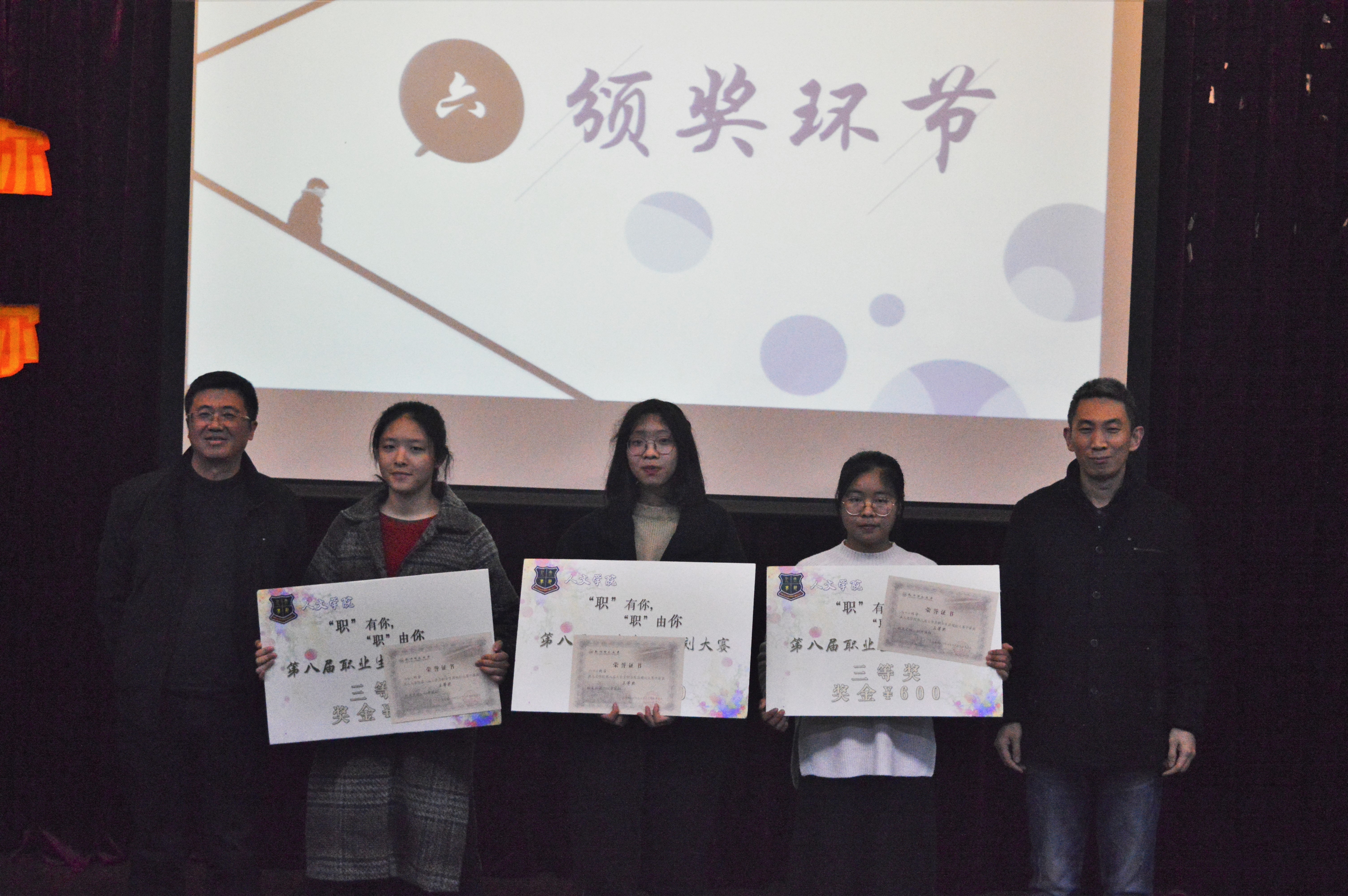 本次决赛以“‘职’有你,‘职’由你”为主题,经过初赛、复赛的选拔,六位选手脱颖而出进入决赛。决赛由选手们按抽签顺序进行10分钟的登台展示与15分钟左右的现场答辩两部分组成。决赛选手从职业市场环境、自我测评分析、不同时期规划、职业生涯风险等方面对自己的规划进行了全面而细致的讲述,展现出x小黄书 学子朝气蓬勃的青年风采。每位选手在答辩环节也得到了评委嘉宾们的殷切鼓励与中肯独到的建议。最终,中文163班的竺世佑同学以其独特的戏剧表现方式和真挚的仁爱之心获得了此次比赛的一等奖,中文163班的吴安妮和中文161班的徐苏杭同学获得了二等奖,汉教181班的何昕怡、中文172班的陈思羽、人教171郭勤亿获得了三等奖。