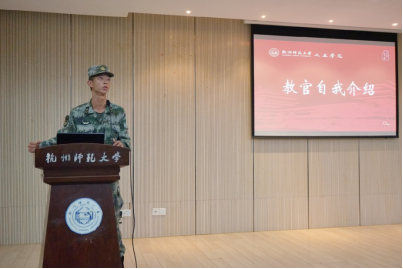 2019级新生代表、来自汉语言文学类193班的杨驰同学代表全体参训新生进行宣誓。动员大会上还举行了授军训旗帜仪式。
