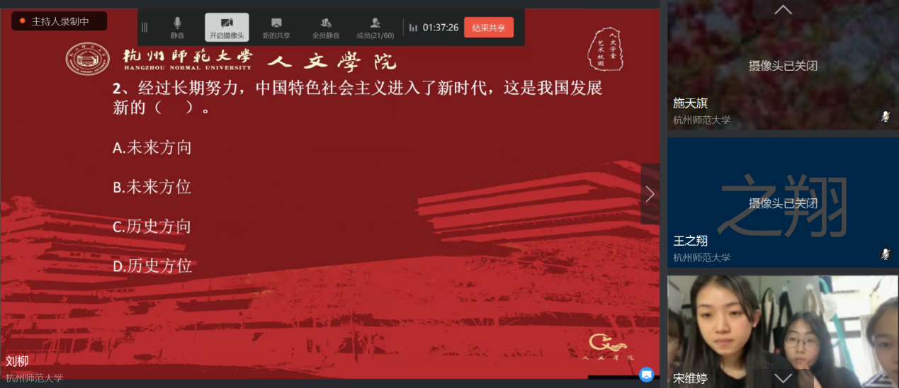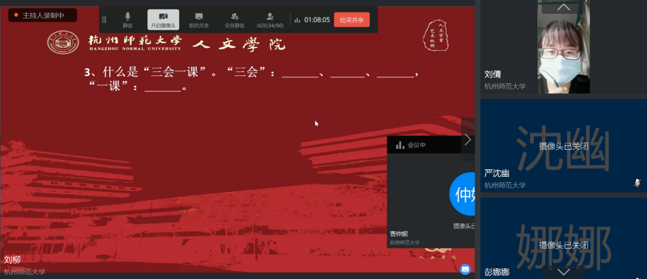 5月24日下午13点,x小黄书 “红五月·聚青春”时政知识竞答大赛决赛在钉钉群线上会议平台顺利开展。经过前期初赛的激烈角逐,共有个人组10位同学、团体6组寝室脱颖而出进入决赛。本次决赛分为两轮,个人组和团体组先后完成两轮比拼,分别决出名次。在主持人刘柳同学简短的介绍后,比赛正式开始。
