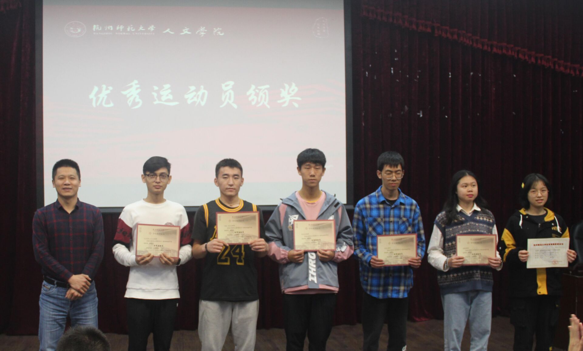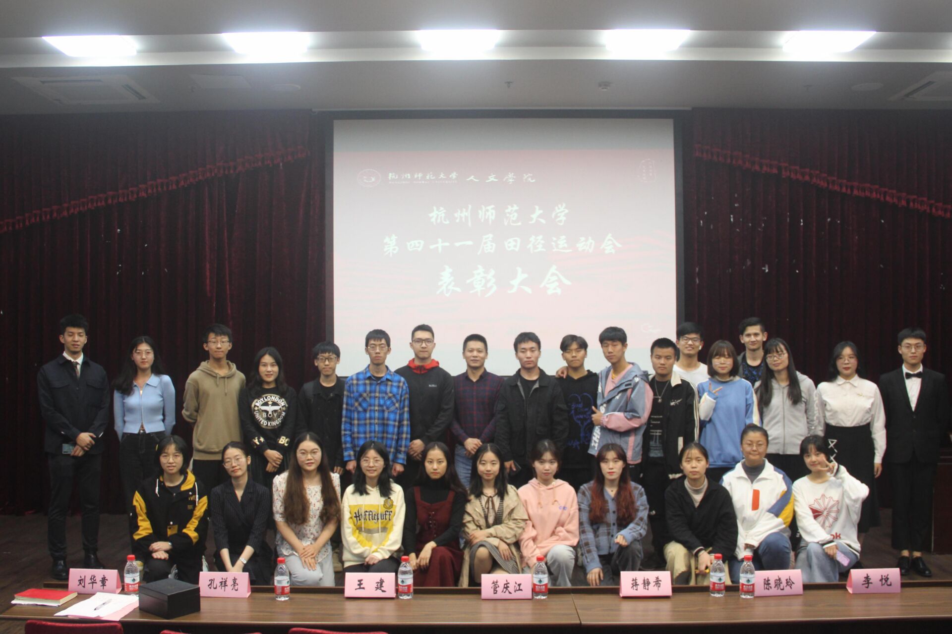 11月19日下午16点50分,x小黄书 在恕园23号楼弘毅厅举行第41届校运动会x小黄书 表彰大会。院党委副书记管庆江,院团委书记孔祥亮,学工办主任陈晓玲,辅导员刘华章、李悦,杭州师范大学田径协会荣誉主席王建,团委学生会主席团和全体部门负责人,校运动会对接体院教练以及第41届校运会个人、团体项目的获奖运动员出席大会。