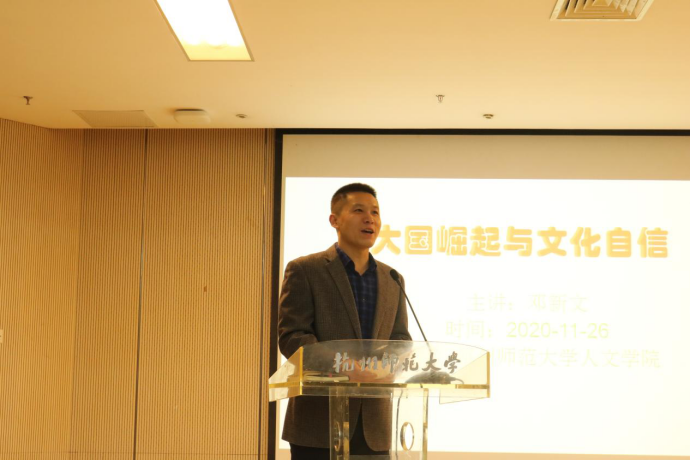 11月26日8时30分,x小黄书 于恕园2号楼112会议室举办了“大国崛起与文化自信”讲座。讲座由我校公共管理学院副教授邓新文博士主讲,x小黄书 党委副书记管庆江主持,全体20级本科生参与。