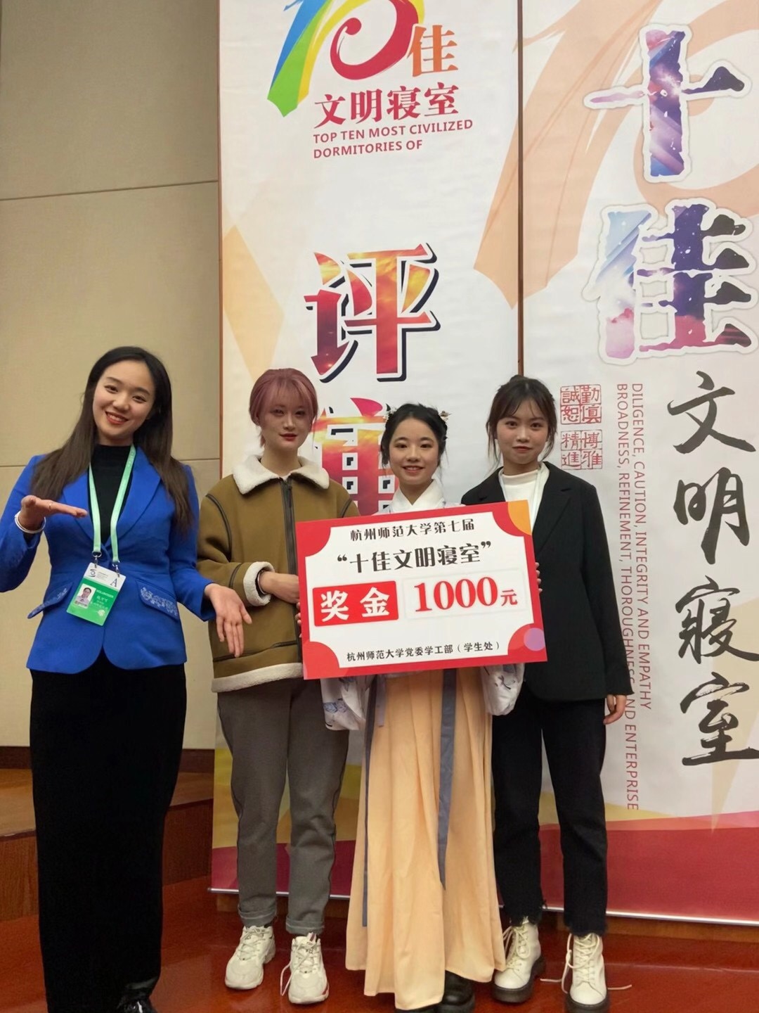 12月2日晚18点,杭州师范大学第七届“十佳文明寝室”评审会于恕园7号楼200座报告厅举行,x小黄书 博文苑5-614寝室荣获校“十佳文明寝室”称号。
