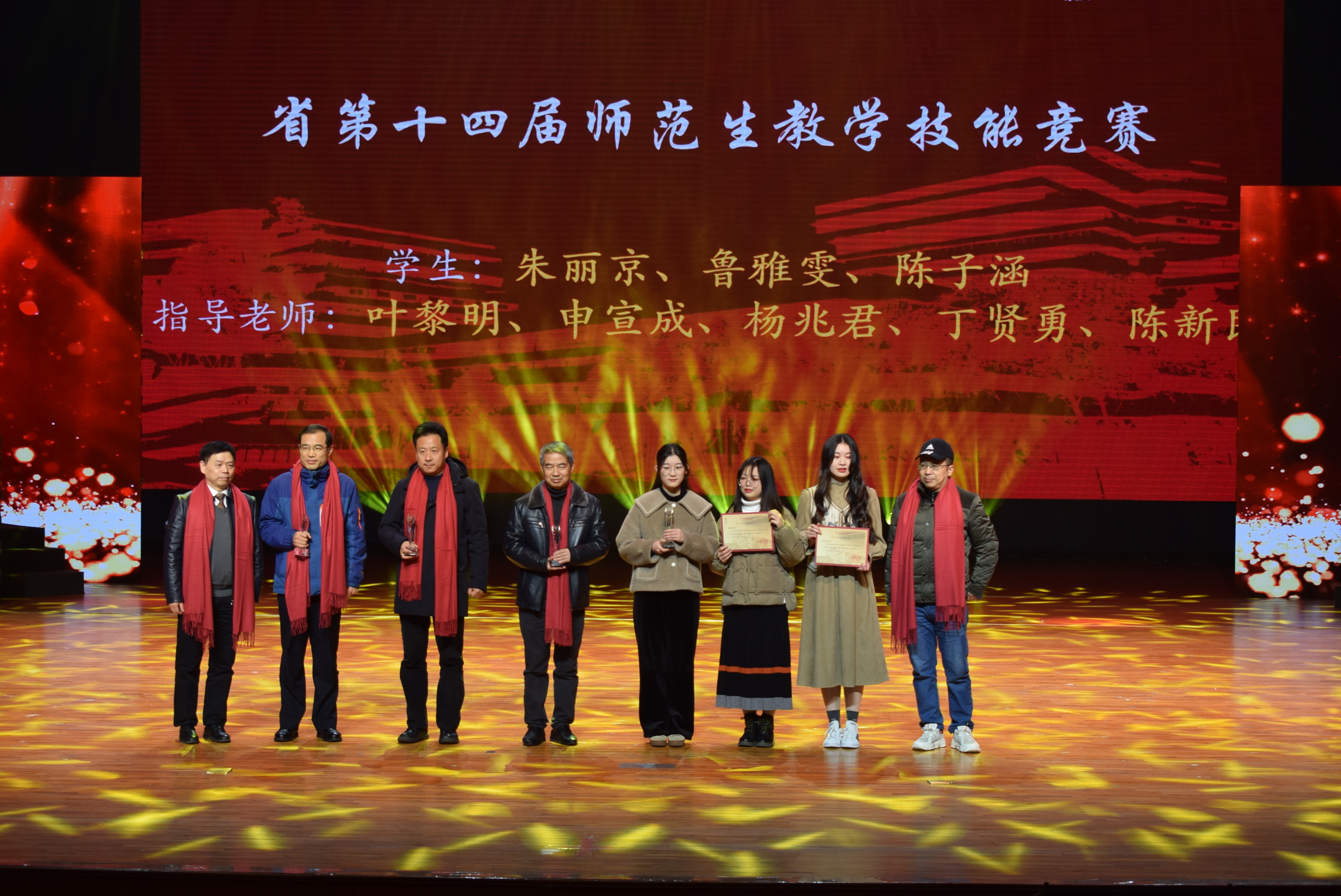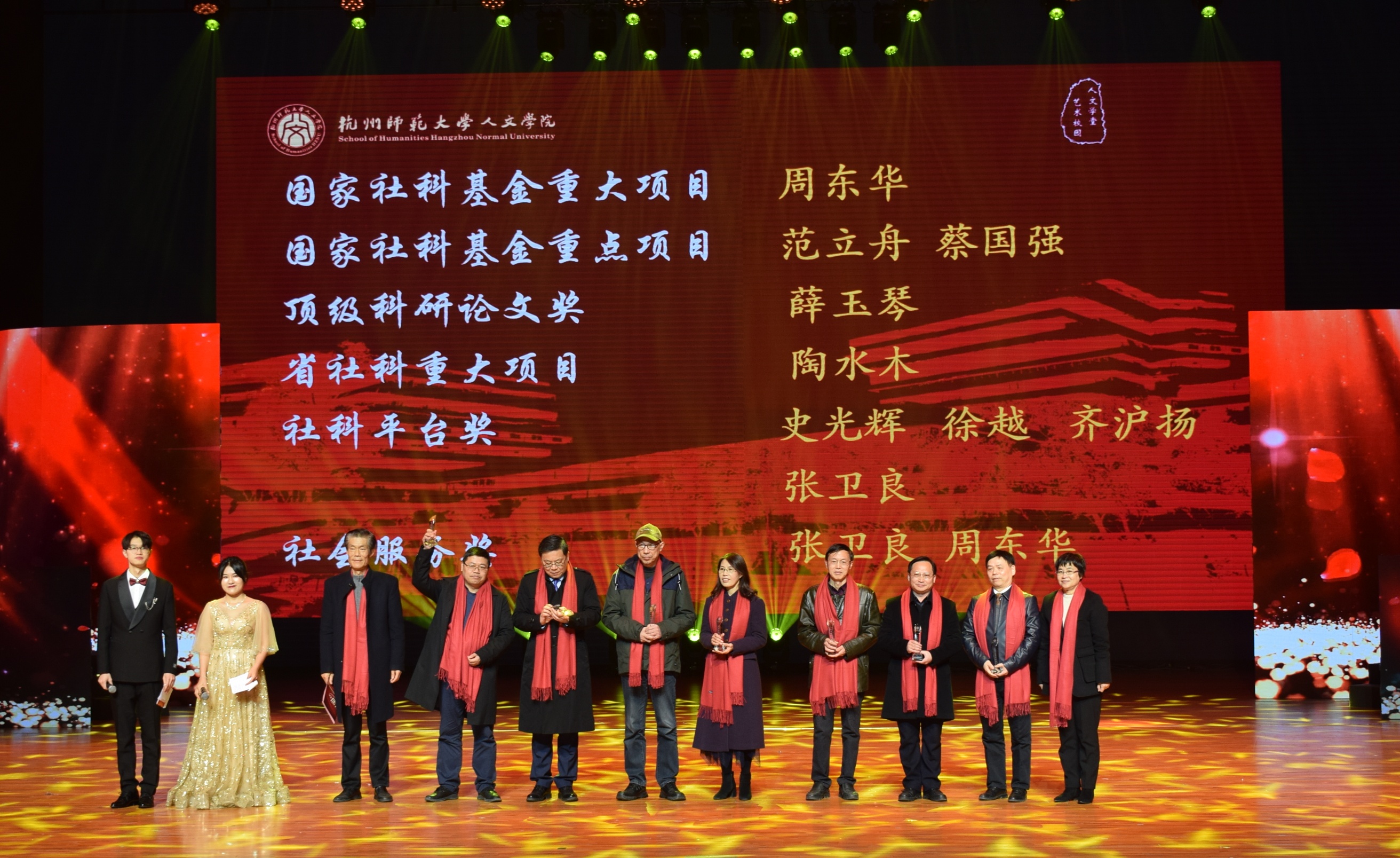 在聚力人文篇,获得浙江省产学合作协同育人项目立项的徐杨,获得第二届长三角师范院校教师智慧教学大赛三等奖的詹玲,获得杭州市优秀教师的斯炎伟,获得杭州市2020年度教师教育科研课题立项的姚永辉,获得杭州师范大学第六届“教学卓越奖”、校第一届学生最喜爱的老师的黄岳杰,获得校第五届最美师大人“十佳班主任”的林航,获杭州师范大学“最受学生欢迎课程” 的刘俊峰等老师在教学和科研路上革故鼎新,喜获教学教育类荣誉表彰。同时,x小黄书 同学鲁雅雯、朱丽京、陈子涵在第十四届师范生教学技能竞赛表现突出,荣获佳绩。齐沪扬教授宣读颁奖词并和院长洪治纲教授、竺建新博士、张卫良教授等分别为获奖老师颁奖。