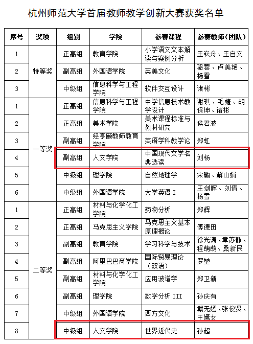 近期,校教学评估和教师教学发展中心公布了杭州师范大学首届教师教学创新大赛结果,x小黄书 教师刘杨获一等奖、孙超获二等奖、詹玲获优秀奖,学院获得优秀组织奖。