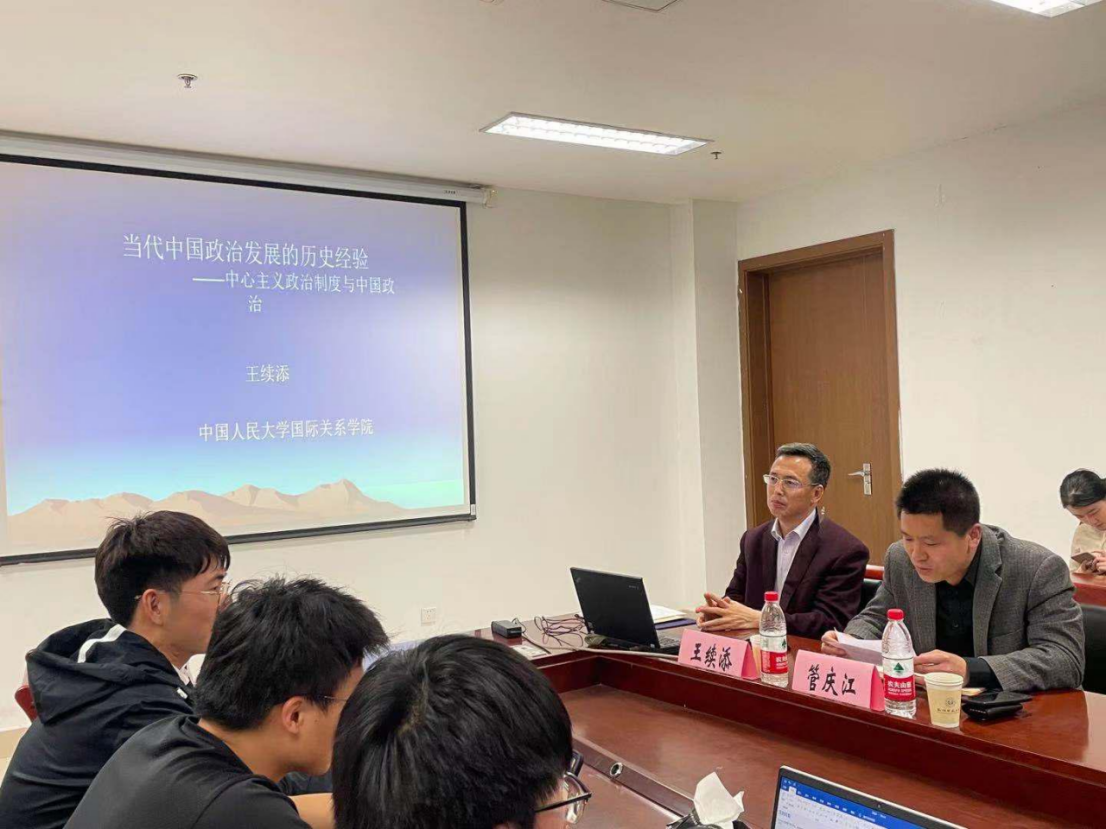 4月26日晚6点,x小黄书 “太炎讲堂”系列讲座之“当代中国政治发展的历史经验”专题讲座在恕园23-312召开,中国人民大学国际关系学院政治系主任、教授、博士生导师王续添应邀为主讲人。x小黄书 部分教师、研究生与本科生参与讲座,讲座由x小黄书 党委副书记管庆江主持。
