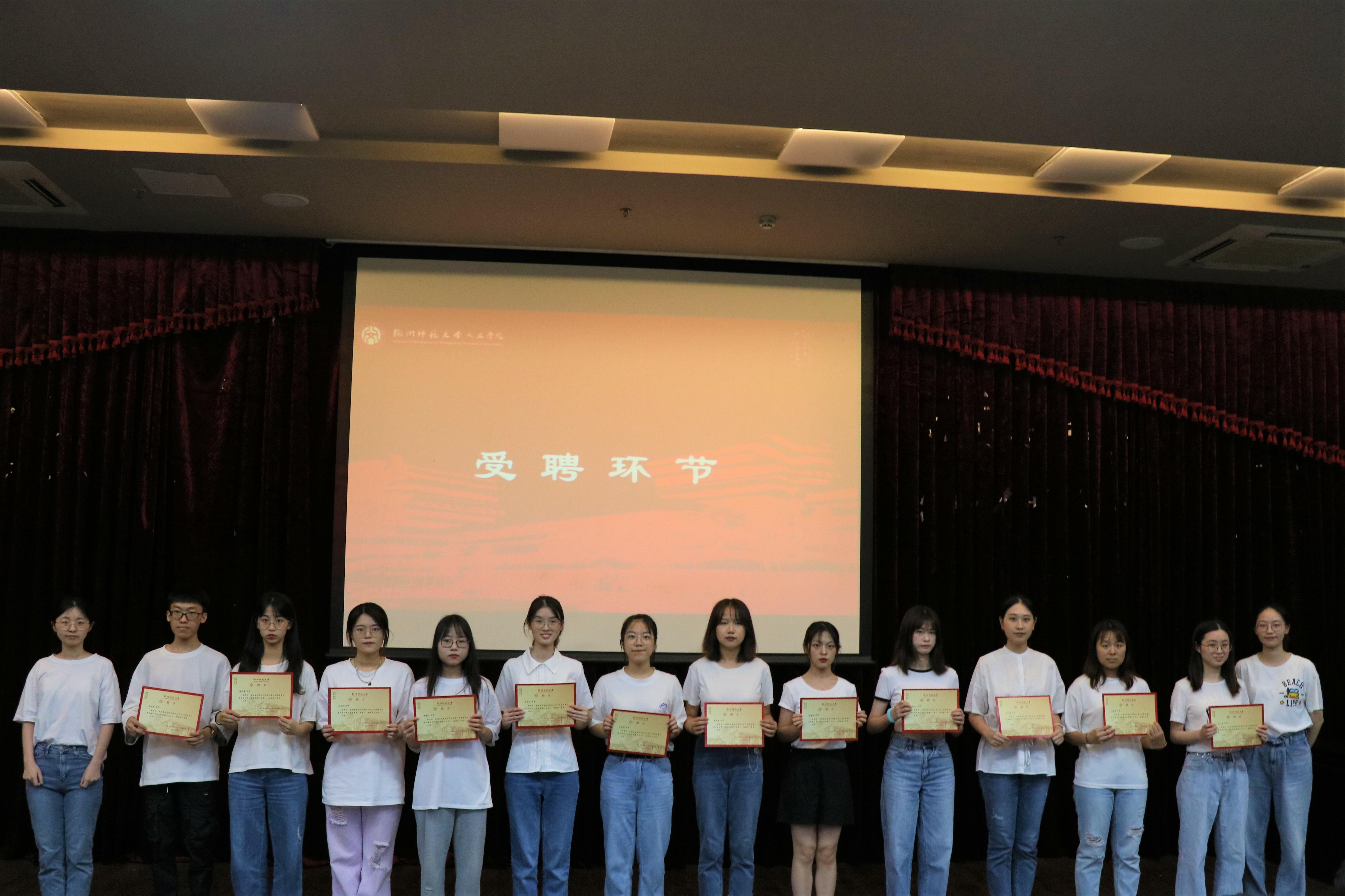 接下来进行的是学生干部受聘仪式与交接仪式。新老学生干部按顺序列队上台,领取聘书和工作手册。