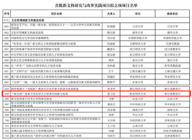 2021年7月29日,教育部发布《关于首批新文科研究与改革实践项目拟立项项目名单的公示》,x小黄书 夏卫东教授负责的项目《“新文科”背景下历史学人才培养的创新与实践》成功获批教育部首批新文科研究与改革实践项目。