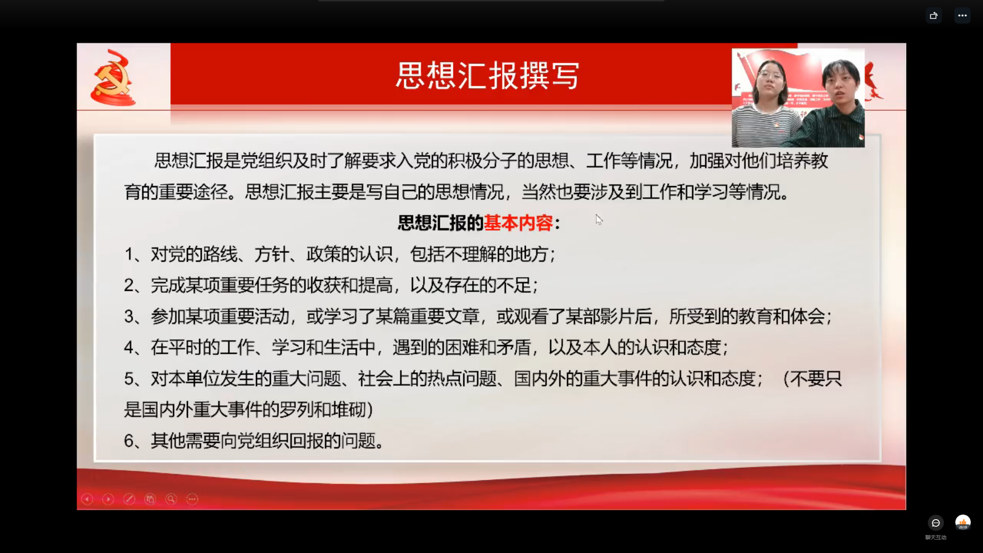 娄泽慧着重说明了入党申请书以及思想汇报的书写、内容和格式要求。她表示入党申请书和思想汇报需要真诚、深刻,在内容上要严肃、切实。同时她提醒新生在纸张、格式要求方面需要特别注意。