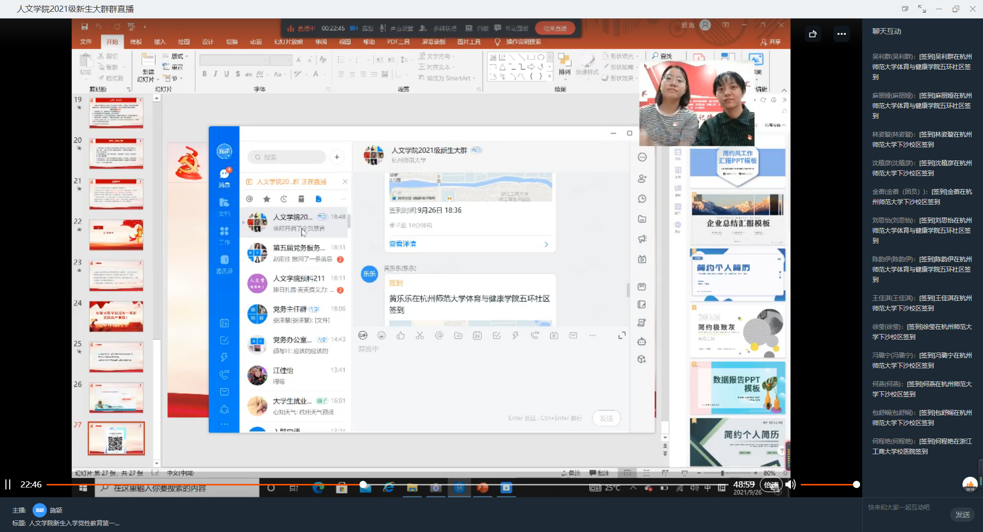 为帮助2021级新生明确思想目标,提高思想水平,9月26日晚18时,x小黄书 “新生入学党史学习教育第一课”讲座在钉钉线上举行。讲座由学院组织员刘华章主持,并邀请党务服务中心主任施颖、娄泽慧作“如何成为一名共产党员”的分享。