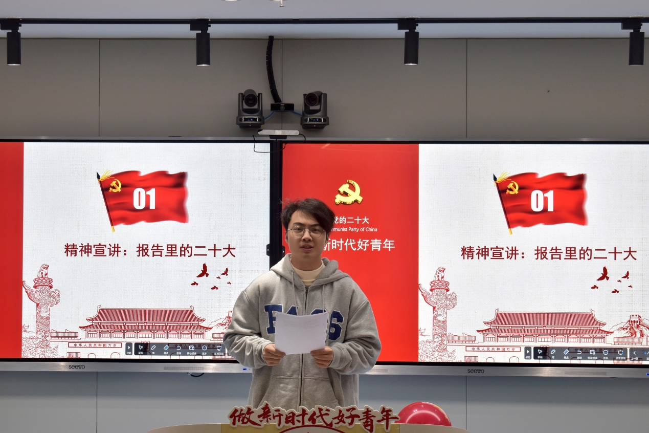 班会把“党的二十大中的青年”作为切入点,以一段精彩的学生自制VCR拉开班会序幕。在“精神宣讲:报告里的党的二十大”环节,严天宇同学以“把握历史主动”为主题,提出新时代青年不仅要学习积极,更要走进社会实际,真切落实党的二十大精神。随后,陈思羽、祝飞扬和杨绿野三位同学分别从“报告中的青年力量”、“大会中的青年力量”和“在身边的青年力量”等三个角度阐释了他们所感受到的青年力量。陈思羽同学从“报告中的青年力量”着眼,提出青年人应有理想、有本领、有担当;祝飞扬同学分享了大会中的杰出青年力量,如於若飞投身志愿救援、姜丽娟帮助下姜村脱贫攻坚,号召同学们向他们学习;杨绿野同学则提供了在身边的青年力量的范例,从疫情中的“最美逆行者”到身边同学的支教,向同学们吹起了“青年正当时”的热血号角。