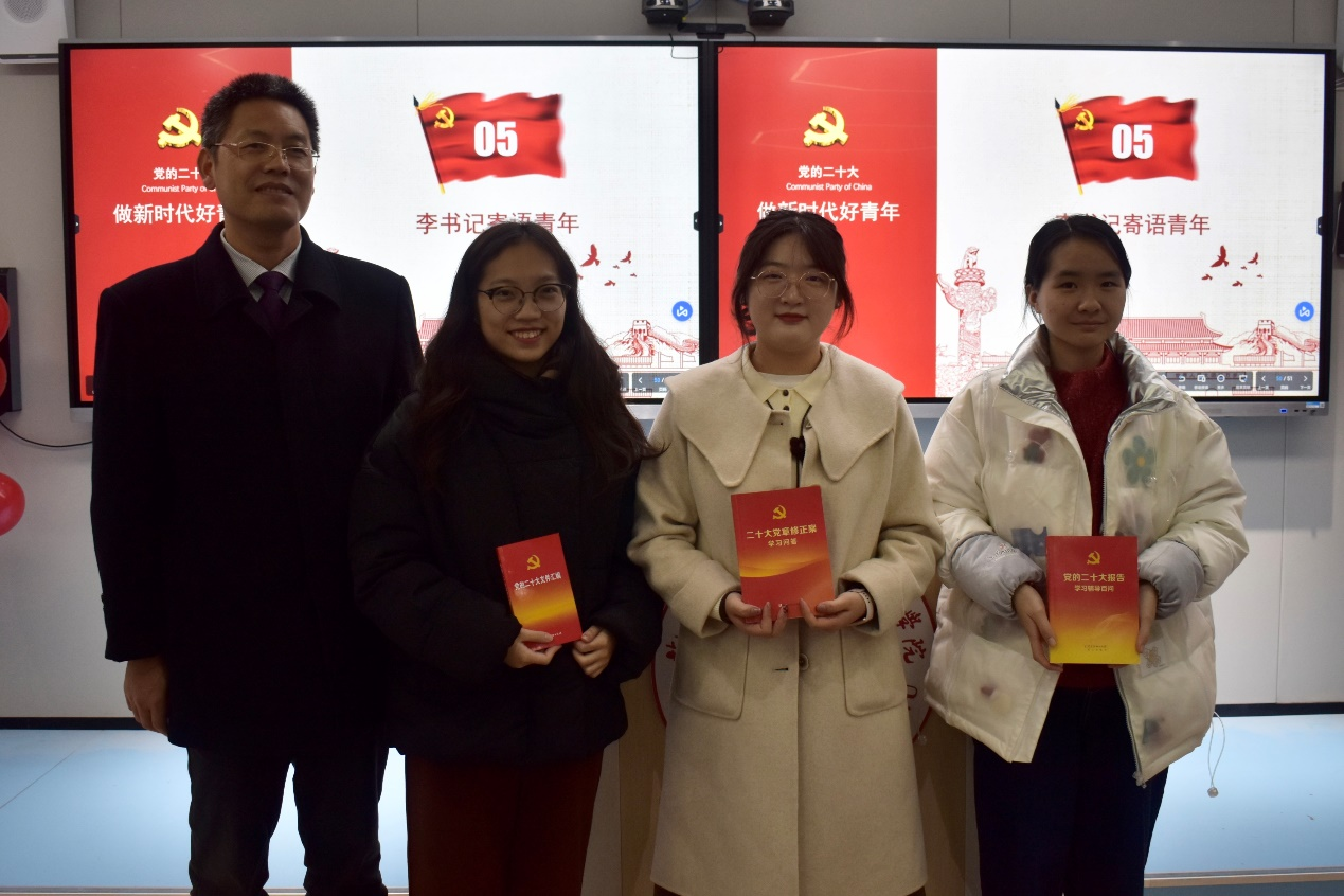 班会最后,李泽泉书记为知识竞赛前三名同学颁奖,并以更开阔的视角,更高层次的格局给同学们提供了宝贵的经验,他寄语同学们,以学习党的二十大精神为契机,在历史学习中把握三个方面要点:扎实掌握历史知识;深入做好历史研究;真正掌握历史理论。最后他殷切祝愿人文学子立足当下,从实际出发,在时代舞台下做习近平总书记寄语的“有理想、敢担当、能吃苦、肯奋斗的新时代好青年”,为祖国建设蓝图出自己的一份力。