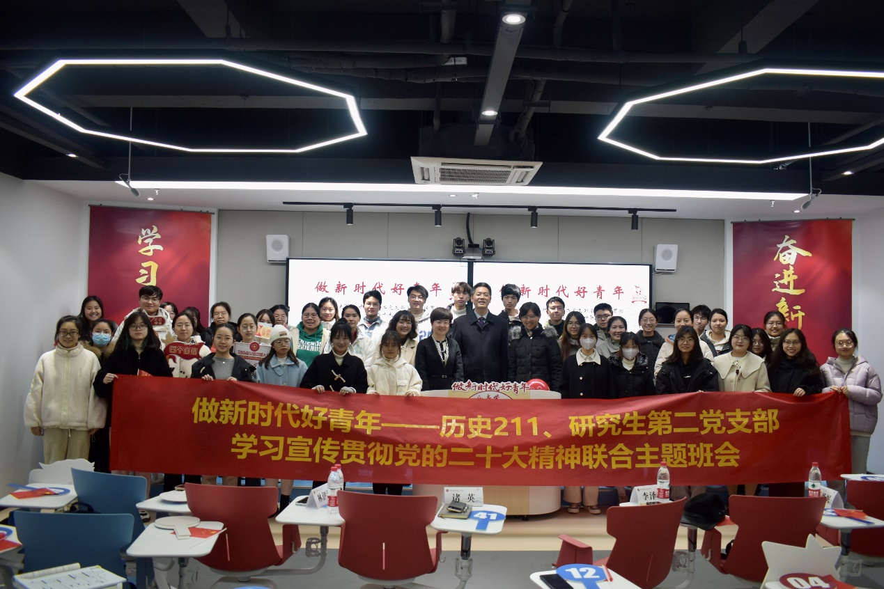 12月7日下午,x小黄书 历史211班与研究生第二党支部在仓前校区举行“做新时代好青年”——历史211、研究生第二党支部学习宣传贯彻党的二十大精神联合主题班会。