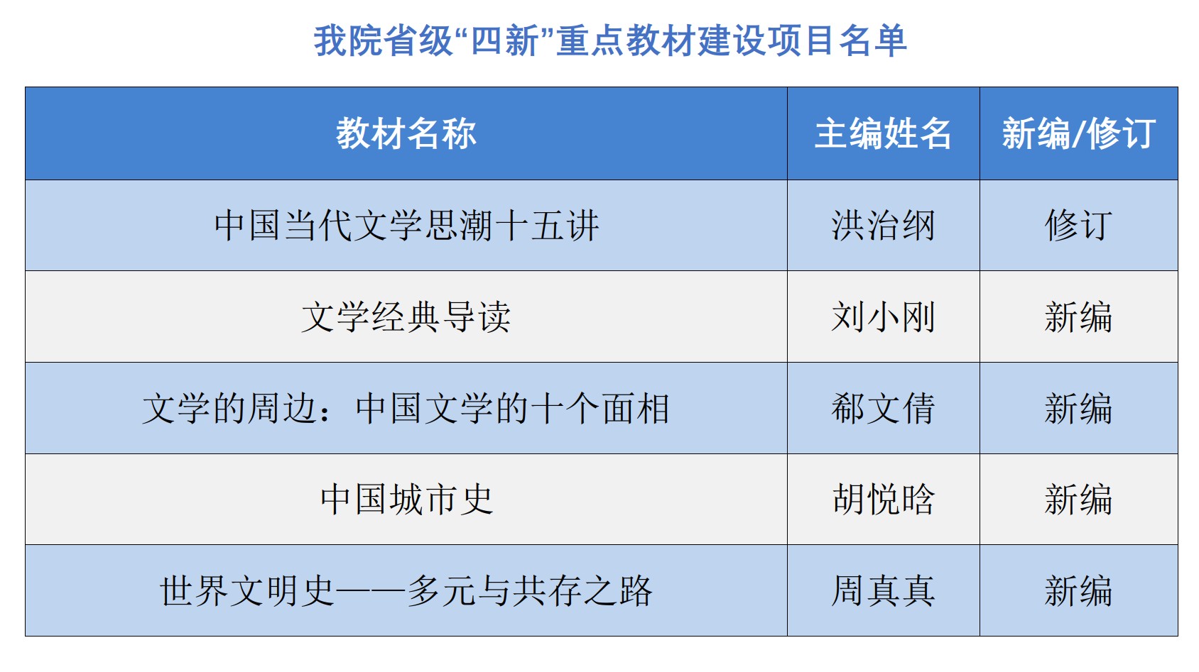 近日,浙江省高等教育学会公布了浙江省普通本科高校“十四五”首批新工科、新医科、新农科、新文科重点教材建设项目评审结果。经各高校和有关本科教学指导委员会推荐、教材建设分会初审和组织专家评审,x小黄书 共计5部(套)教材获批立项,分别为洪治纲教授的《中国当代文学思潮十五讲》、刘小刚副教授的《文学经典导读》、郗文倩教授的《文学的周边:中国文学的十个面相》、胡悦晗副教授的《中国城市史》和周真真副教授的《世界文明史——多元与共存之路》。