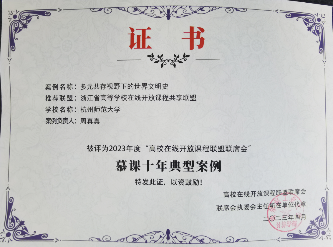 5月13日,全国慕课教育创新大会(第四届)暨高校在线开放课程联盟联席会2023年会在广州召开。会上发布了2023年度“高校在线开放课程联盟联席会”慕课十年典型案例,x小黄书 周真真副教授负责的《多元共存视野下的世界文明史》入选。