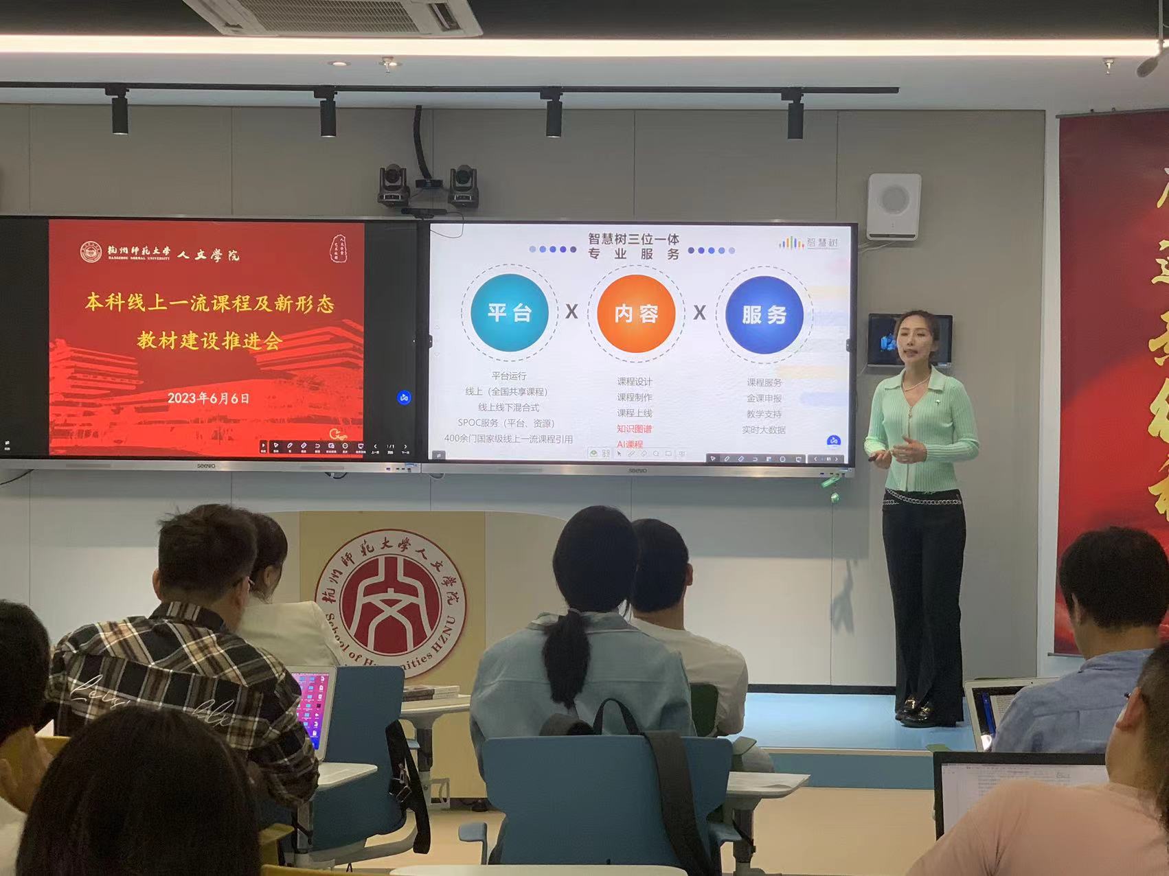 会议伊始,国家级、省级一流课程负责人詹玲做课程建设经验分享,她指出,团队协作、课程特色、教学设计都是非常重要的因素。随后,省级线上一流课程及新文科教材负责人周真真作分享,她重点介绍了课程线上运行、课程与教材建设一体推进的重点难点。会议上,智慧树负责人结合课程建设经验与自身平台特色,着重介绍线上一流课程具体申报及建设情况;浙大出版社负责人围绕立体化和新形态教材建设,介绍了重点教材系列建设情况和成果。