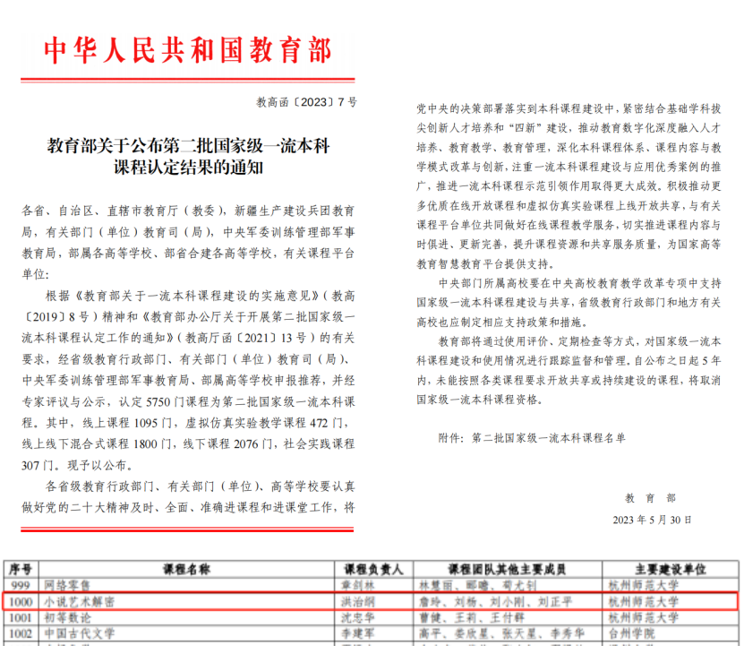 近日,教育部办公厅发布了《教育部关于公布第二批国家级一流本科课程认定结果的通知》(教高函〔2023〕7 号),x小黄书 洪治纲老师负责的《小说艺术解密》课程入选线下一流课程。