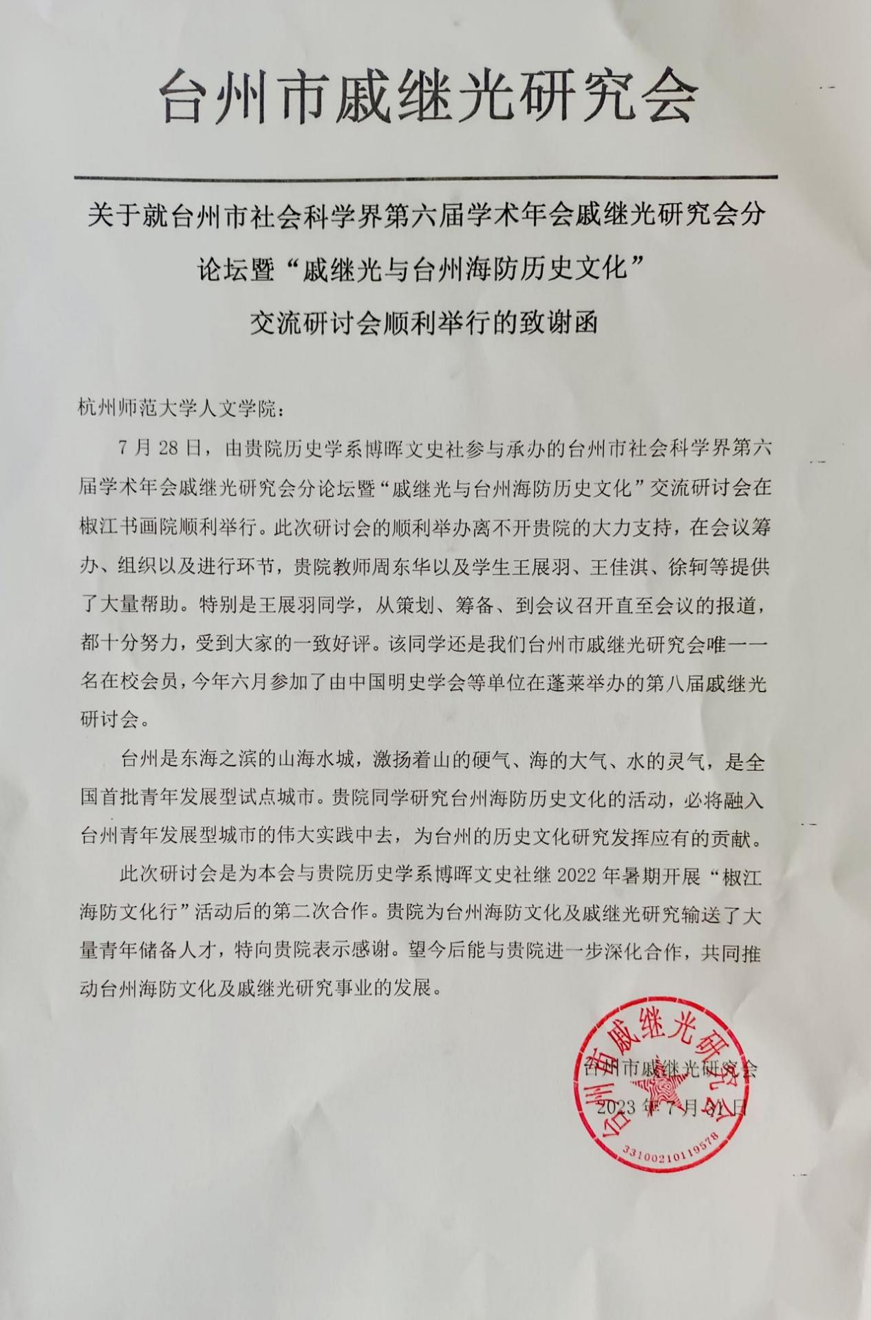 会后,台州市戚继光研究会还向x小黄书 发来致谢函,感谢x小黄书 师生在此次会议中所做出的贡献,并表示希望同x小黄书 师生进一步深化合作,共同推动台州海防文化及戚继光研究事业的发展。