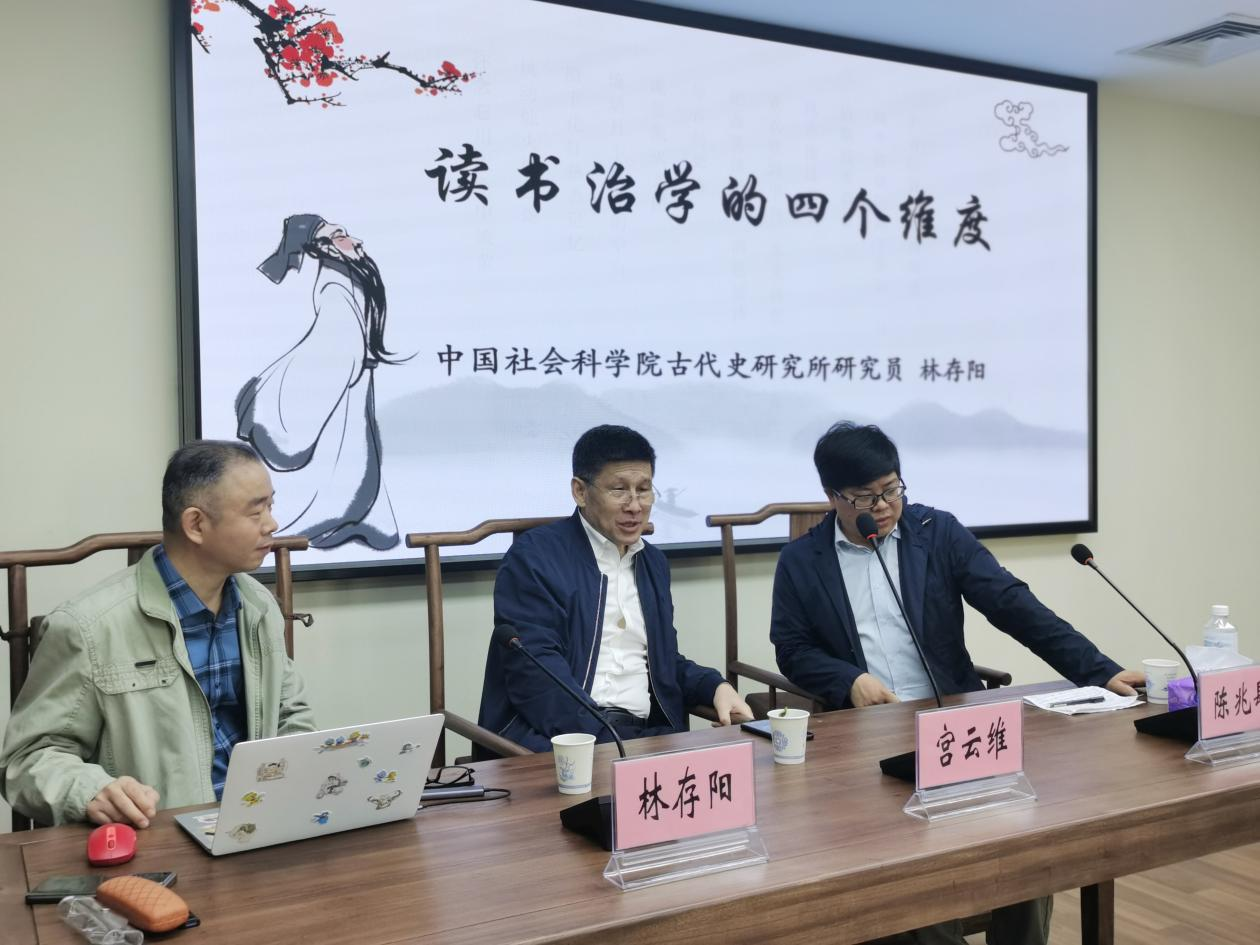 太炎讲堂系列讲座在恕园23号楼314会议室召开,中国社会科学院古代史研究所研究员、博士生导师林存阳老师受邀作题为“读书治学的四个维度”的报告,历史系陈兆肆教授担任主持人,浙江工商大学历史系教授宫云维教授参会与谈。x小黄书