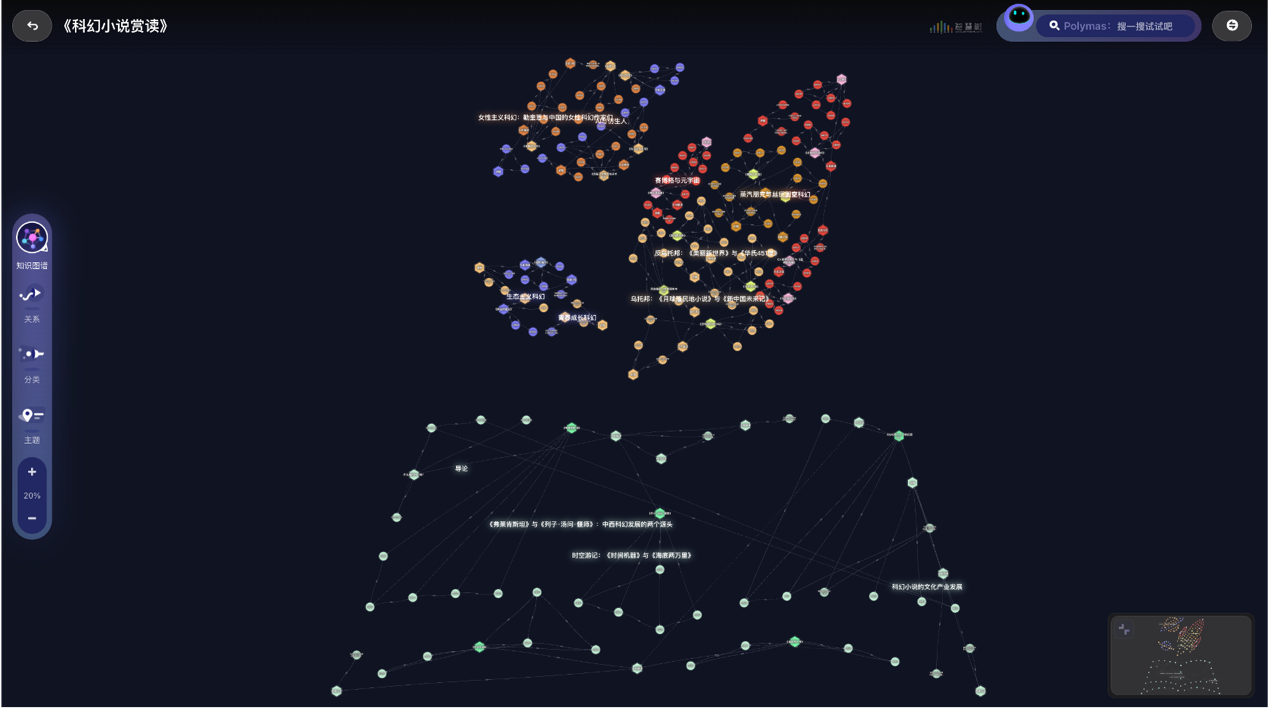 《科幻小说赏读》是杭州师范大学汉语言文学国家一流本科专业(建设点)的专业选修课程,也是浙江省课程思政示范课程。作为汉语言文学专业学生的专业选修课之一,课程将科学精神、创新精神与现实关怀融入文本阅读、研究,所覆盖的知识点具有跨学科交叉性,对于文科学生而言有一定难度。为帮助学生深入理解课程的知识点及其相互联系,课程团队利用知识图谱的思想和技术,构建了一张覆盖课程全领域、结构清晰的知识图谱。