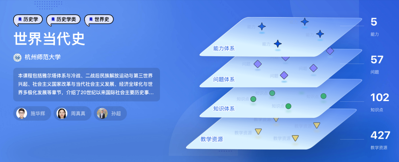 该知识图谱课程由施华辉、周真真、孙超三位老师合作建设完成。课程内容包括雅尔塔体系与冷战、二战后的民族解放运动与第三世界兴起、社会主义国家改革与当代社会主义发展、经济全球化与世界多极化发展等,涵盖了去殖民化过程、世界社会经济发展趋势、国际关系变迁等主题。