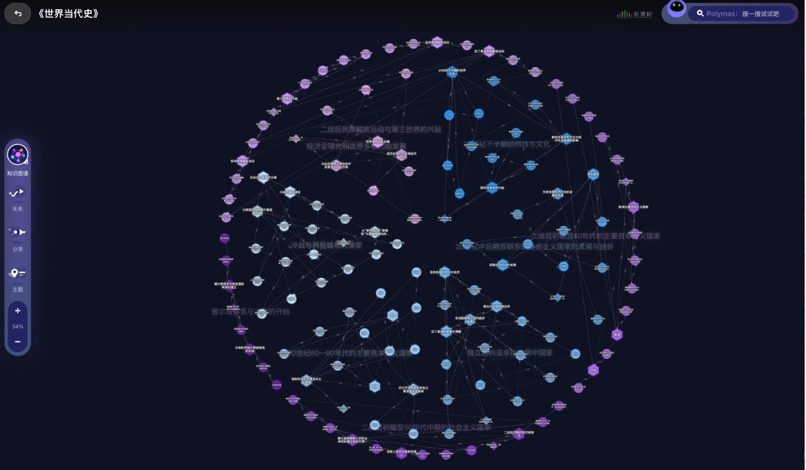 该课程旨在帮助学生系统了解世界当代史的发展轨迹,熟悉各个阶段当中,资本主义世界、社会主义世界、其他发展中国家的变化,引导学生掌握世界当代史的基本理论和发展规律,使学生具备认识和分析相关问题的能力,以及良好的人文素养和正确的价值观。基于以上目标,课程的知识图谱共建成102个知识点、绘制233个知识点关系、匹配427个教学资源。