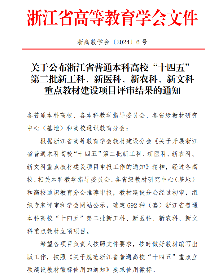 浙江省普通本科高校“十四五”第二批新工科、新文科、新医科、新农科重点教材建设项目,以名师大家打造浙派精品教材为宗旨,紧紧围绕立德树人根本任务,统筹考虑“四新”建设和新时代科技、医药、农业、文化创新高地建设,探索学科研究和课程教学新范式,推动人工智能、大数据等新一代信息技术与各学科专业深度融合,创新多学科交叉的人才培养,致力于构建更中国、更现代、更创新、更融合、更开放的具有浙江特色的人才培养体系,实现浙江省高等教育高质量高水平发展。