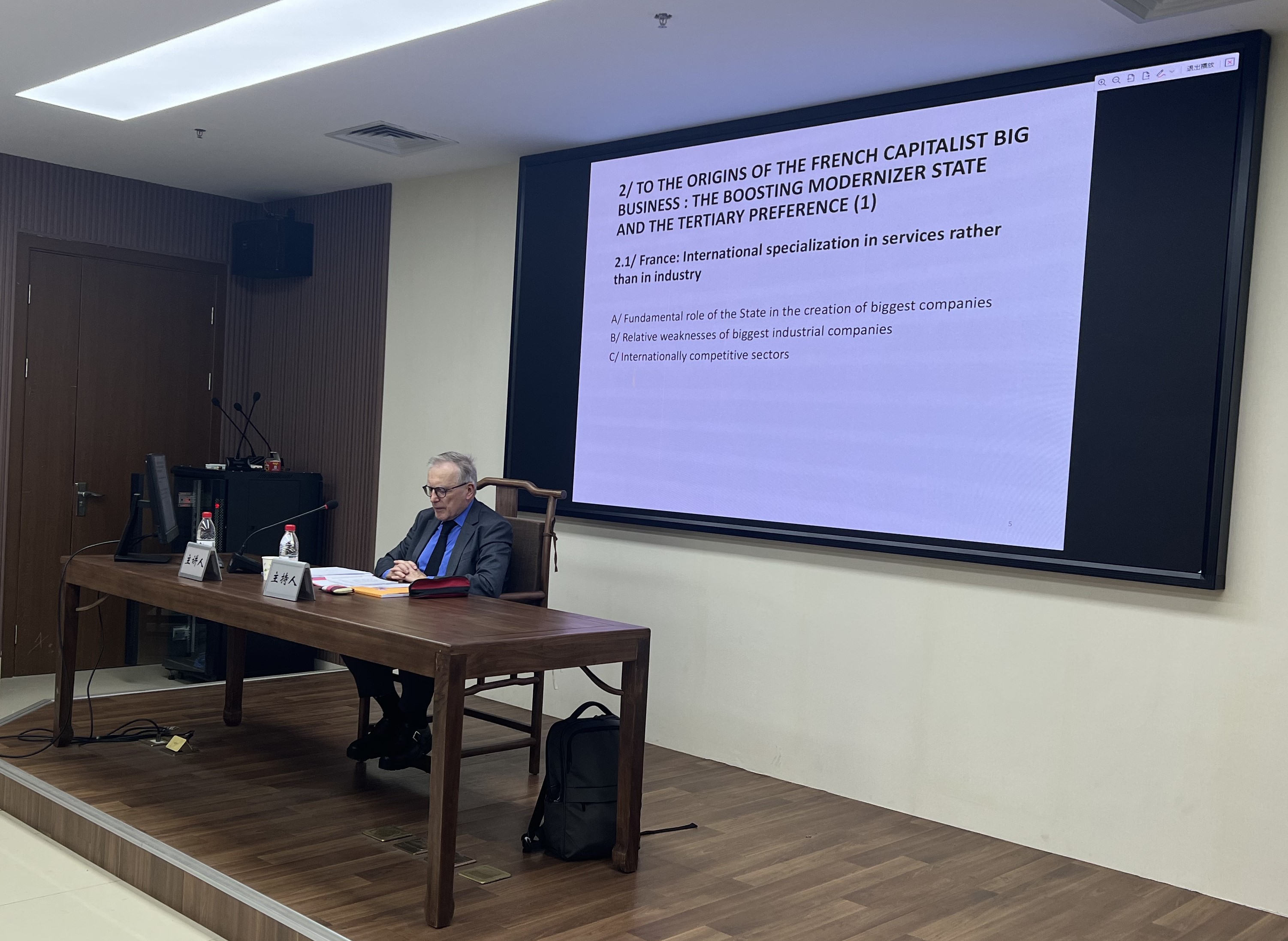 2024年11月7日下午,太炎讲堂“海外名家”系列讲座在杭州师范大学仓前校区恕园23号楼314会议室召开。法国索邦大学现代经济史荣誉教授Dominique Barjot(多米尼克·巴尔若)受邀作题为“Is There a French Model of Capitalism?”(是否存在法国资本主义模式?)的分享。历史系林航教授担任主持人。历史系周真真、蔡丹妮、龚天蕙等老师和众多本科生、研究生共同参加了本次讲座: