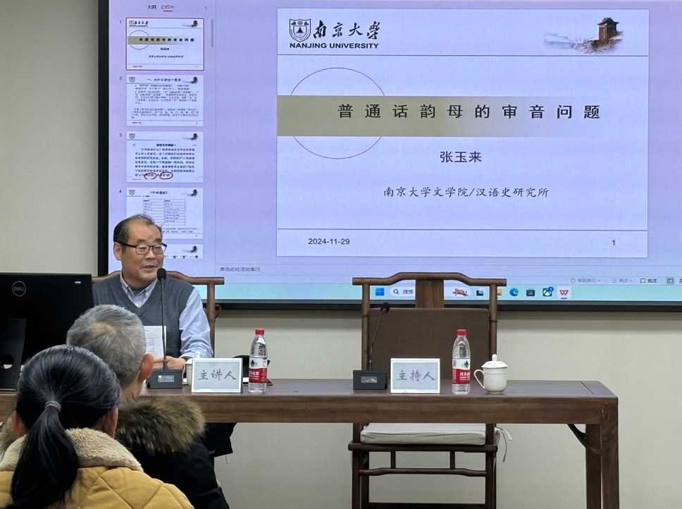 讲座开始,张玉来教授首先阐述这一研究的重要性和必要性。他以"大姐=大解?"等实例切入,指出目前在一些常用词的读音上仍存在不少争议,并且简要概述了音位归纳的程式以及多种可能性,提出音位系统是具体音系历史演变的结果,是使用的全体语感的形态体现。